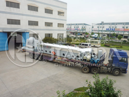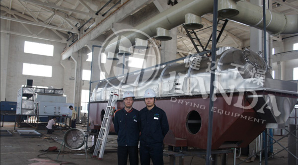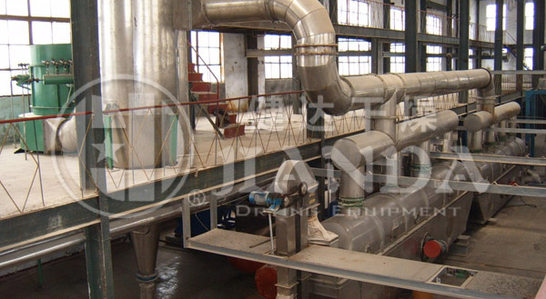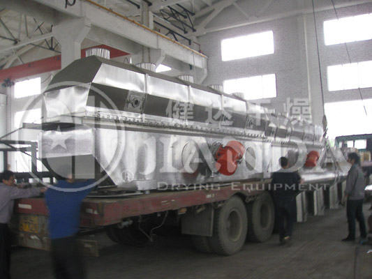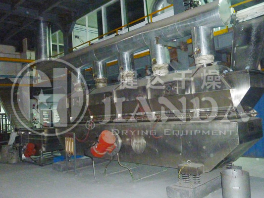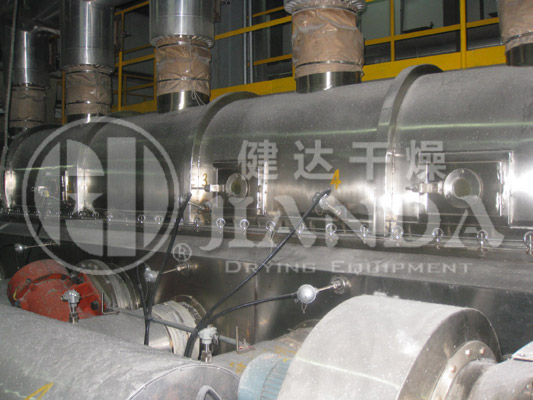 物料自進料進口進入機內,在振動力作用下,物料沿水平面流化床拋擲,向前連續運動,熱風向上穿過流化床同濕物料換熱后,濕空氣經旋風分離器除塵后由排風1:3排出.干燥物料由排料進口排出。